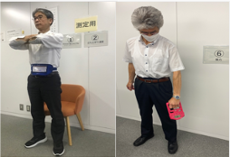 専用の測定ベルトを腰に着用し測定。 結果はリアルタイムで確認可能で、項目ごとに測定結果と体力年齢も数値可され自動評価されます。低い評価項目に関しては、おすすめの運動プログラムも出る為、身体機能の維持向上の継続支援にも繋げています。
